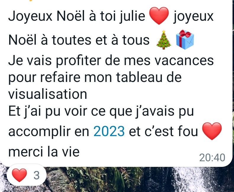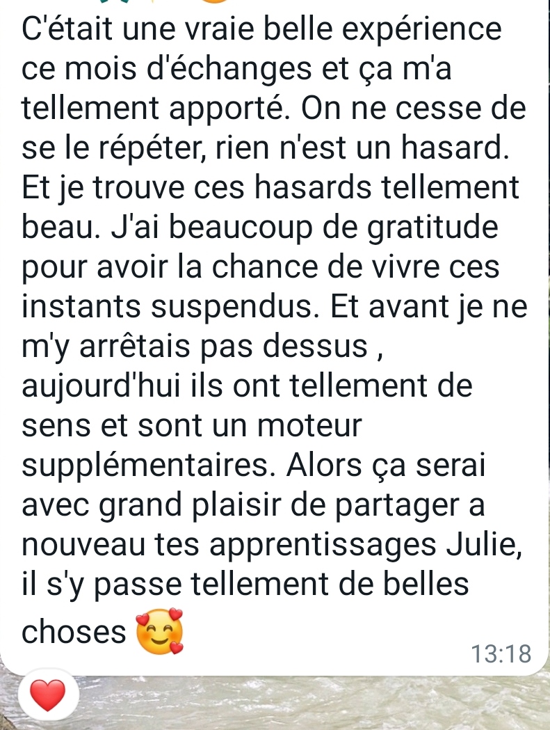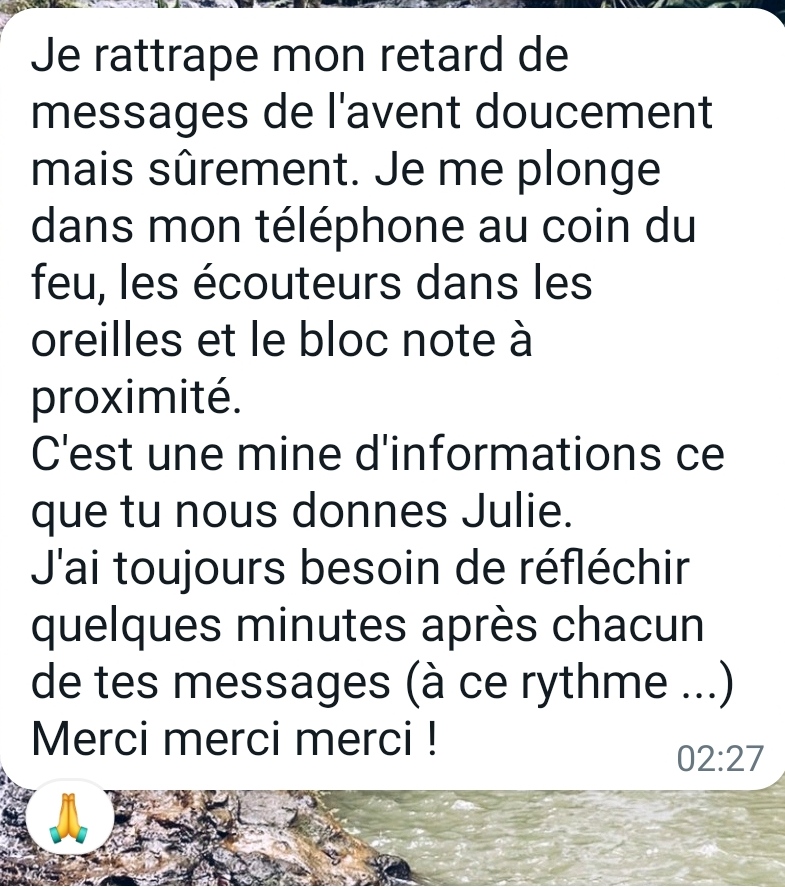 - 1 message inspirant par jour (sous forme écrite ou par vocal) de moins de 30 minutes, avec une question à contempler